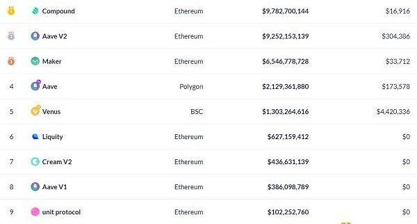 DeFi項目鎖定資產前十排名及鎖倉量,數據來源:Debank