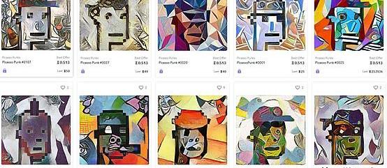 PicassoPunk?(畢加索Punk),?最成功的Punk衍生NFT項目,?電腦根據畢加索作畫風格為1000個Cryptopunk重新繪畫.?我是看見他價格起飛的,?本來前幾百個都只賣0.2ETH,?突然有一個大佬(whale)?或者就是初創團隊一口氣買了20多個,?以1ETH價格成交,?直接沖上了OpenSea的7日交易量排行榜,?然后就火了,?每個持有者都保持默契不在1ETH以下賣出?(Hold?the?line),?每一個Punk的價格就水漲船高.?很多人(包括OG?Punk擁有者和電競明星)也參與了進來,?買下幾個打印出來掛家里也是一種很好的裝飾。