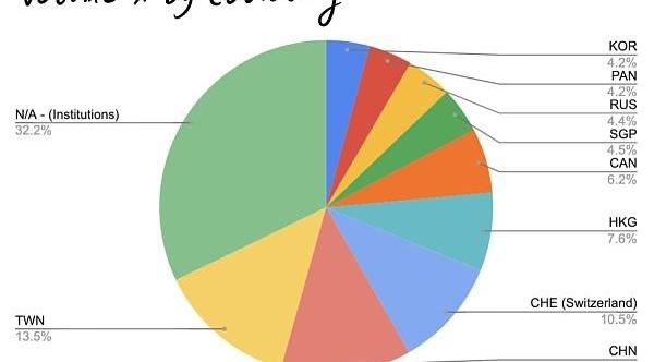 大多數交易量來自機構,FTX沒有按照地區劃分,但除機構之外,大多數交易來自臺灣地區,其次是大陸,以及香港、新加坡、韓國等。這一數據表明,FTX的基本盤在亞洲。