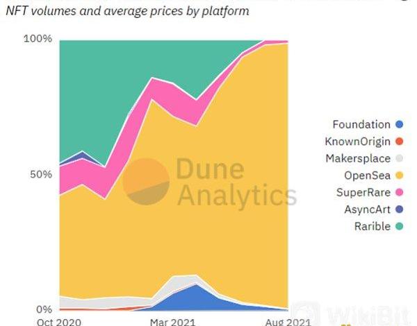 自2021年起,OpenSea的市場份額迅速擴張,從最初的40%迅速增長到98%,幾乎壟斷了整個NFT交易市場。