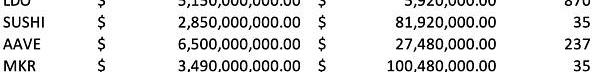 在查看PE時,與該集團相比,Lido似乎被高估了。該協議的交易收益是其收益的870倍,這意味著它的交易倍數是下一個最接近的代幣AAVE的3倍以上,并且是SUSHI和MKR的近25倍。