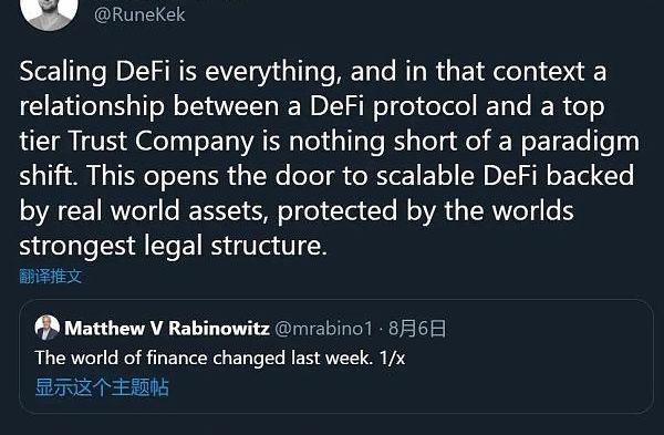 對DeFi而言,這也確實是值得期待的“范式轉變”,尤其是在目前監管面臨關鍵轉折點的時刻,找到一種將DeFi和現實世界資產合法性地相結合的方法,會是DeFi的下一個“Compound起爆點”。