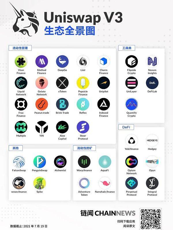 Uniswap創始人HaydenAdams此前發布推特詢問有什么項目在UniswapV3建造,或者將在UniswapV3上建造什么項目,根據各項目方的回復,據鏈聞統計,截止2021年7月19日,UniswapV3在流動性管理、交易工具、流動性挖礦等多個領域繁衍出的各個項目共計43個,其中最多的是流動性管理類的應用有21個,可見UniswapV3自定義流動性范圍的特定給了各個項目更多的發揮空間。