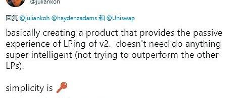 RibbonFinance的社區經理在推特下方回復,將在UniswapV3上構建一個智能的流動性再平衡管理器,用Simplicity區塊鏈智能合約編程語言。