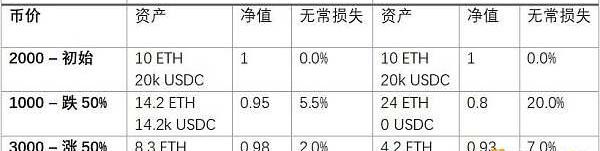 假設當前ETH價格為$2000時存入10ETH和20kUSDC,當ETH價格跌至$1000或漲至$3000時,假設為混合本位計算基于10ETH和20kUSDC初始資產的凈值:
