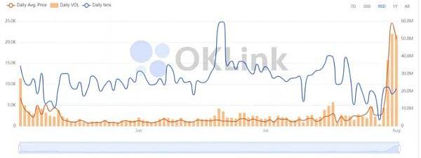 與此同時,NFT的數字收藏品市場的交易量和平均價格均攀升至創紀錄高點。有著“NFT亞馬遜之稱”的OpenSea僅在8月2日當天處理的市場交易額就超過了2020年全年交易額。根據DuneAnalytics數據顯示,截止8月9日,OpenSea8月NFT市場累計交易量達5.47億美元,較7月整月交易量增長68%。根據Cointdesk消息,7月以太坊NFT的交易額達到1.71億美元,比上月同期增長338%。