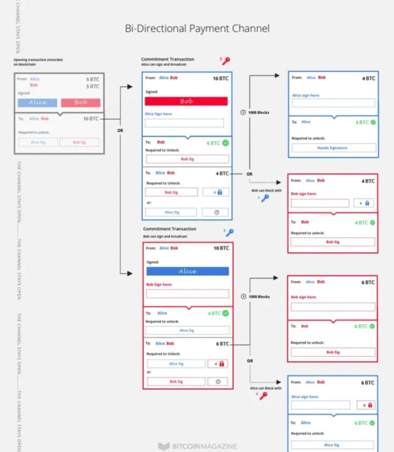 最后,只會有兩筆事務被廣播到比特幣網絡并打包進區塊:開啟通道事務和關閉通道事務。哪怕Alice和Bob之間發生了100萬筆交易也是這個結果,因此極大地減輕了區塊鏈的負擔。