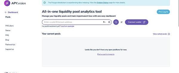 APYVision是一種一體化儀表板和分析服務,用于管理您的DeFi流動資金情況并實時跟蹤您的非永久性損失。它跟蹤您的流動資金的進入和退出以產生洞察力。該服務是由一個小團隊軟件開發人員和流動性提供商構建的,他們看到了向AMM提供流動性的機會,并在最近推出了V2版本。