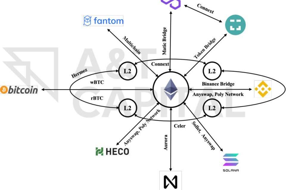 但是,演化仍在繼續:一方面,以太坊底層性能不足,交易緩慢、Gas費用高昂,諸多新興公鏈在不可能三角上進行了相應的取舍,對其進行了補充和擴展;另一方面,這些公鏈之間互不連通,從而導致它們成為了一個個割裂的價值小島——亟需一座座橋梁將它們連通起來,釋放整個加密資產流動性和可互操作性的最大潛力。