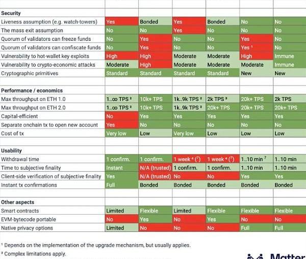 不同的Layer2方案其實優劣各異,MatterLabs此前整理了一份關于各個Layer2方案整體優劣的對比。