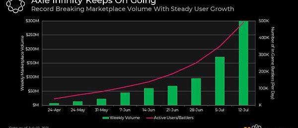 從用戶數上,AxieInfinity的DAU已經超過50萬人,而7月17日DEX協議前十名24小時用戶數合計才不到30萬人次,令人震驚的是AxieInfinity的DAU在三個月前還不到3萬人。同時AxieInfinity的絕大部分玩家在此之前并不了解區塊鏈技術,甚至至今也不懂區塊鏈。相比DeFi,區塊鏈游戲有著非常低的門檻,尤其在打通了法幣入金通道,使用低成本側鏈之后,游戲體驗幾乎與傳統互聯網游戲一致。這也是為什么AxieInfinity的玩家增長如此快的原因。同樣可以預見,區塊鏈游戲將以更快的速度出圈,獲得比DeFi更大用戶群體,這是個比DeFi更巨大的市場。