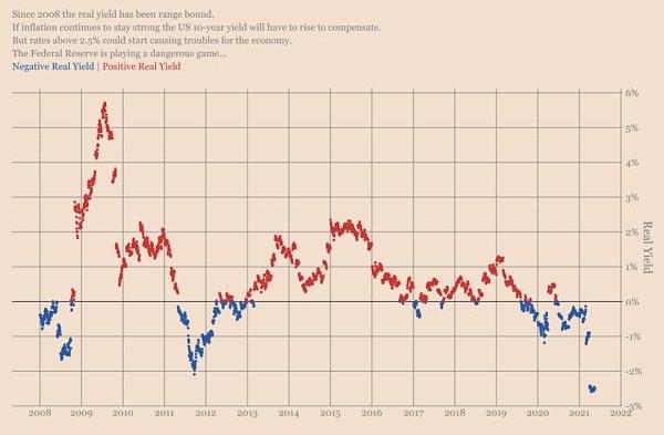 黃金或比特幣等資本保值工具并不會產生利潤。因此,如果用戶能從債券中獲得正的實際回報,那么持有這些資產的資本對用戶來說可能就不那么有吸引力了。但當債券的實際收益率進入負值區間時,轉向其他方式保存資本就變得合理了。