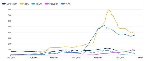 在NFT方面,盡管NBATopShot和Rarible等流行收藏品遇市場降溫,但以太坊的新NFT,例如BoredApeYachtClub(BAYC)和VeeFriends,仍受到了積極的歡迎。BAYC系列于4月底推出,僅6月就吸引了100多個UAW,平均每天的總銷售額接近4400萬美元。