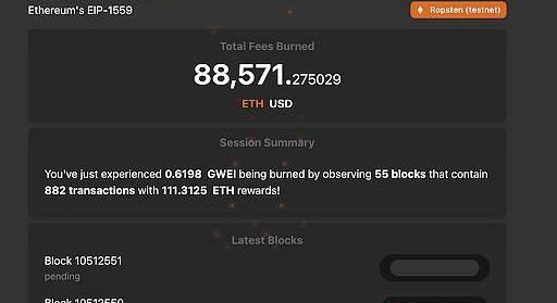 倫敦升級和EIP-1559提案已經在區塊高度10499401部署在了Ropsten測試網。目前社區正在觀察EIP-1559的表現,以及gas費會怎么變化。最近,許多文章和評論都刊登了http://watchtheburn.com/這個網站的截圖,這個網站在監測有多少ETH被BaseFee燃燒掉。