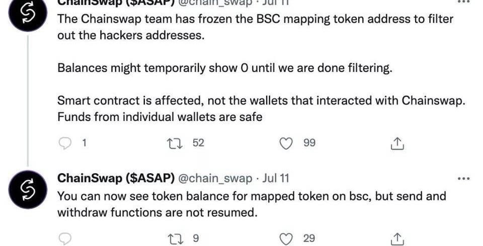 事件發生之后,ChainSwap表示,已經凍結BSC映射代幣地址以過濾掉黑客地址,將對攻擊前的ASAP持有者和LPs空投1:1的新ASAP代幣,并將對受影響的代幣實施補償計劃。