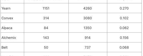 對上述項目代幣的經濟模型做簡單的分析,我們可以發現$YFI、$ALPACA、$ALCX、$BELT與$INST一樣,都是純粹的治理代幣并不捕獲協議收入,只有$CVX則可以捕獲Convex的部分協議收入。而且相當部分代幣的流通率都還較小,針對流通市值的比較意義不大。因此我們選取全流通市值/TVL,作為橫向估值評估的觀測點——