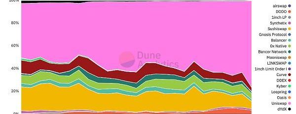上圖:截止2021年6月28日各大DEX基于其交易量的市場份額。來源:DuneAnalytics