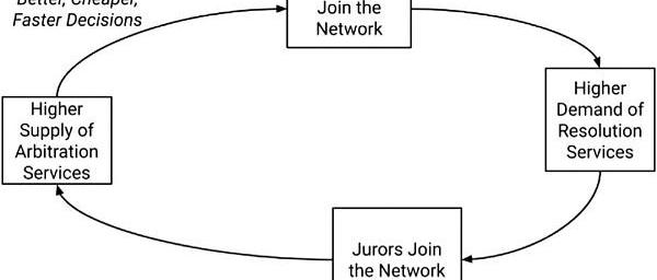 去中心化司法平臺依賴于網絡效應行程低成本的爭端解決方案。當當事人使用去中心化司法平臺時,這將產生對解決服務的需求,從而提高價格,并激勵陪審員加入該網絡。解決爭議服務供應的增加推動市場調整機制走向平衡,降低爭議解決服務成本。隨著每輪周期的發展,越來越多的用戶加入網絡,不斷增加的專業化會產生更好、更便宜、更快的決策。