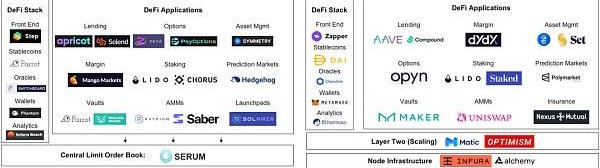 下面是兩個不同的DeFi生態系統的地圖報告,一個建立在Solana生態系統上,另一個建立在以太坊生態系統上。