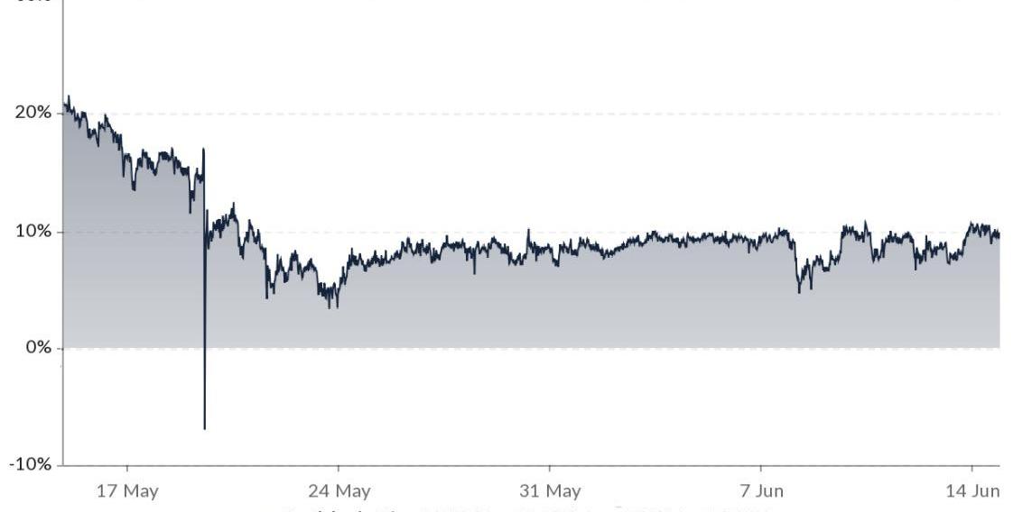如上圖所示,自5月20日以來,期貨基礎一直低于11%,并且在測試5%時多次進入看跌區域。當前水平表明頂級交易員持中立立場。