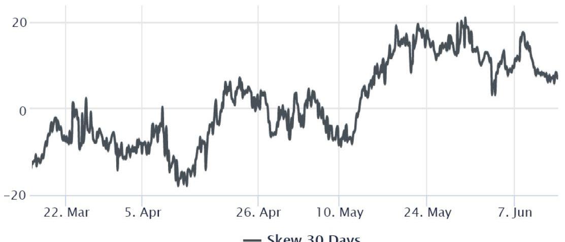 上圖證實了包括套利者和市場做市商在內的頂級交易員,目前對比特幣價格感到不安,因為中性至看跌的看跌期權溢價更高。不過,目前7%的正偏態遠低于5月下旬出現的20%的“夸張恐懼”。