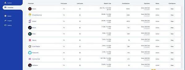 Fuyao:在開始時,Karura競拍啟動的24小時內,KSM鎖倉量突破20萬枚,總鎖倉價值已經突破1.05億美元,在某種程度上也創造了歷史,也有效了下驗證了波卡通過這樣的方式實現了真正去中心化的治理和技術支持,之后Karura也不斷在突破質押的整數關口,到目前?Karura總鎖定數量已突破36.2萬KSM,總鎖倉價值已達到1.5億美金,總參與人數已突破12,200人,大家也可以根據這個網址查看實時排名: