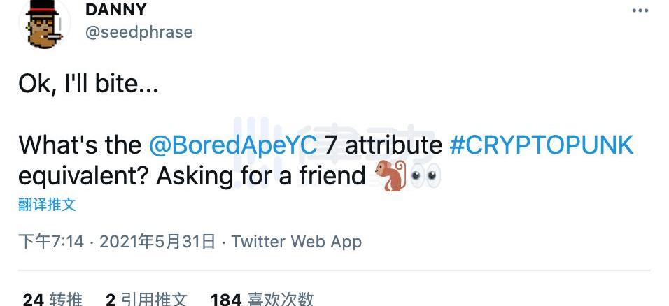 而另一位NFT收藏家DANNY似乎也要購買他的第一只猿猴,他發推求助希望買到一只具備稀有屬性的猿猴。