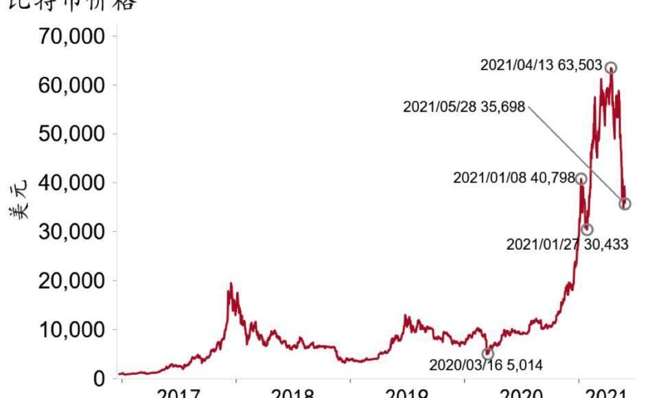 進入5月,今年以來一路高歌猛進的比特幣出現崩盤式行情。5月11日,特斯拉老板埃隆·馬斯克宣布中止接受比特幣購車付款計劃,比特幣和其他加密貨幣價格應聲大跌,一周時間內下挫三成;由于幣圈在中國異常活躍,從保護投資者利益出發,5月18日中國互聯網金融協會等三家行業協會發文,要求成員機構不得開展與虛擬貨幣相關的業務;5月21日,國務院金穩委第五十一次會議進一步明確「打擊比特幣挖礦和交易行為」。至此,幣圈風云突變,比特幣價格從4月的歷史高點下跌幅度最多接近五成。