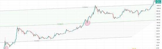 再看下BTC2017年的牛市走勢,研究可以發現這一輪牛市和之前13年牛市走勢類似,前期一路拉升,年中迎來了一波大幅度調整,調整極限位置也剛好位于0.5趨勢支撐線附近,后續走勢如圖中所示,強勢洗盤籌碼充分換手后,BTC反身向上快速拉升繼續牛市新高走勢,在牛市最后的瘋狂期,價格也是攀升至1位置附近,所以這一輪整體走勢和13年基本相似。