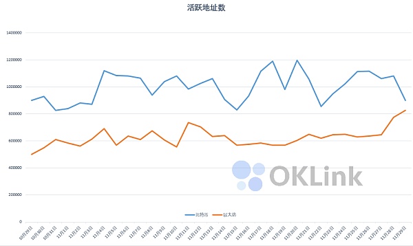 XRP/HKD-6.45%OKLink上周(11.23-11.29)比特幣和以太坊鏈上數據周報。