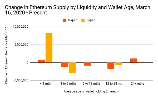 當我們將比特幣今年的使用與以太坊進行比較時,投資者對比特幣作為避險資產的看法變得更加清晰。此外,比特幣變得無流動性的數量比以往任何時候都要多,因為它們進入了錢包,這些錢包發送出去的比特幣要比流入的數量少得多,也就是這些比特幣被當做長期投資來持有。另一方面,以太坊正在變得更具流動性,流入了那些不僅交易頻繁而且還很新的錢包。