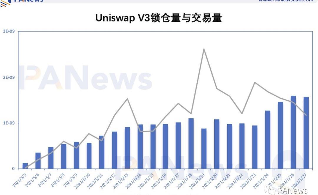對比UniswapV3和UniswapV2的數據,目前UniswapV3憑借比V2更低的流動性,捕獲了更多的交易量。以5月28日的數據為例,如下圖所示,UniswapV3的鎖倉量只有15.8億美元,但過去24小時成交量為9.23億美元。而UniswapV2的鎖倉量有57.2億美元,過去24小時成交量只有7.41億美元。