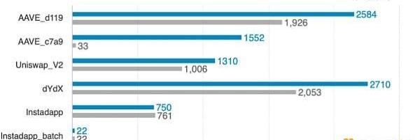 本報告中分析的dYdX、Aave以及UniswapV2以各自獨特的方式提供具有一定差異性的閃電貸服務。dYdX只提供三大主流資產USDC、DAI和ETH并占領了這些資產的閃電貸市場。UniswapV2提供還款通證可以與借款通證不一致的特殊閃電貸服務,從套利角度來看,可以減少用戶交易時必須換回借款通證的步驟因而降低一定Gas費用。而Aave提供封裝好的閃電貸函數,在用戶還款時可以直接通過調用智能合約獲得計算好的借款金額和手續費,而另外兩個協議則需在外部計算并手動歸還。同時Aave的閃電貸功能也是其他服務類協議的主要調用對象。