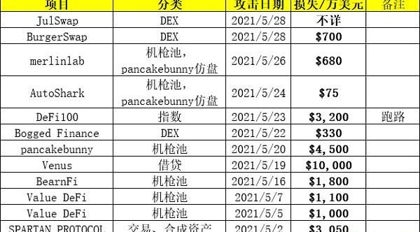 即將過去的5月,對于BSC來說,是最灰暗的一個月。本月有11個項目集中暴雷,包括BSC最大的借貸平臺Venus、BSC最大的機槍池pancakebunny、BSC最早的DEX平臺BurgerSwap。這些項目在被攻擊前,有些正如日中天,有些早已落寞。被攻擊后,有些平臺應對得力,社區重拾信心。