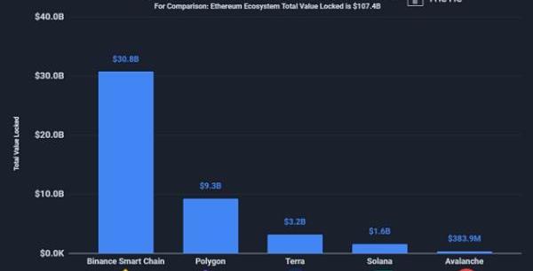 以太坊多年來一直是智能合約平臺的市場領導者,因此以太坊生態系統的市值為7946億美元也就不足為奇了,這比第二大生態系統幣安智能鏈多出600%。但由于以太坊高昂的GAS費,使得新用戶不得不尋求其他方法,許多人已經開始探索替代鏈。除以太坊外,目前有三個智能合約平臺的全生態系統市值超過500億美元:BSC、Polkadot和Polygon。目前Solana的市值為380億美元。