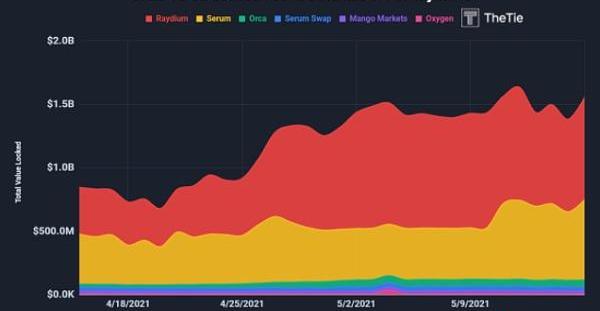 在Solana上的TVL中,16億美元是一個歷史新高,這當中主要由Raydium和Serum占絕大部分,它們的總TVL為14億美元。