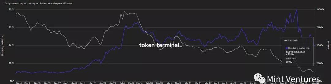 我們發現,雖然Aave的總市值在不斷上漲,但是后半段時間由于其收入增速更快,導致PS值反而持續下降,Aave的PS高點出現在21年的2月5日,高達97.09倍;而目前5月30日Aave的PS值已經創出有史以來的新低點,為12.76倍。