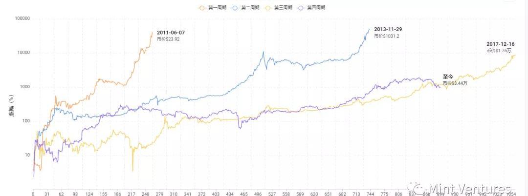 目前市場整體處于牛市大漲后的回調中,估值中樞明顯回調,市場消泡沫明顯。相對于上一輪牛市高點20000美金,本輪牛市最高點64510相較于上輪頂部的20000美金,最大漲幅僅222%,而回撤后的目前漲幅為73%左右,明顯小于過往牛市的整體漲幅。從時間角度看,本輪牛市從底部上漲走過的時間,也遠遠未達上一輪牛市的時間。