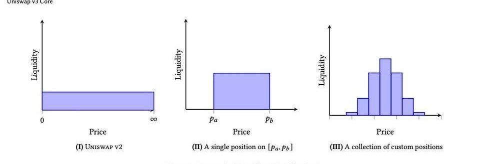 相比于V2「分配均勻」在所有價格點上相同的流動性,V3的流動性是由一系列不同區間上的流動性組成,這樣就緩解了部分資金閑置、利用率低的問題,下圖形象地表現了流動性如何分布。