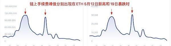 以太坊5月多指標創新記錄,既與ETH的價格在當月攀上歷史新高有關,也與后來突然而至的崩盤相關,特別是礦工收入的鏈上交易費部分,在5月12日ETH高價之日和5月19日暴跌之日,交易費都站上了礦工日收入的高點。