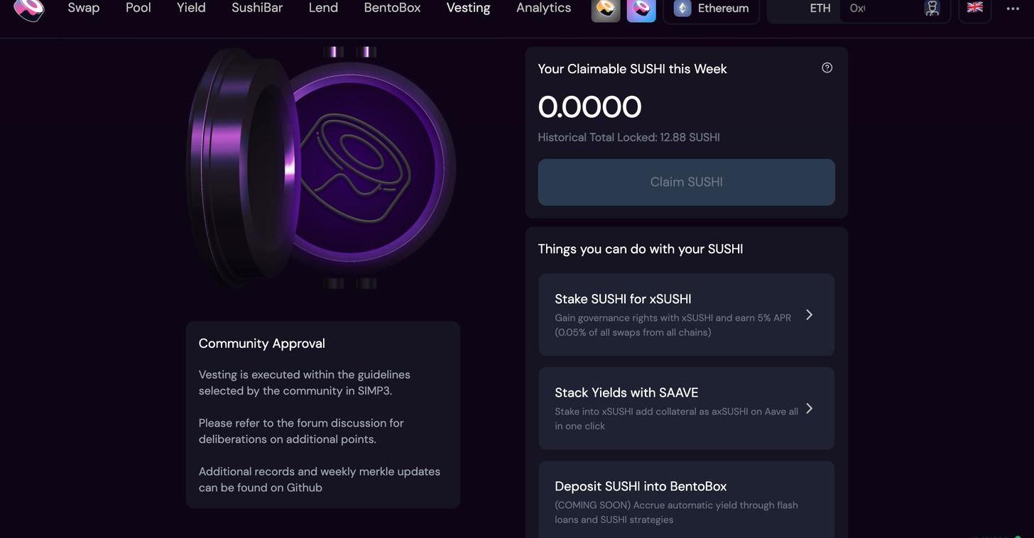 點擊Vesting,我們可以在這個界面里申領收益農耕所產生的SUSHI獎勵。每周,我們可以申領6個月前所產生的SUSHI獎勵的2/3。新獲得的SUSHI可以用來: