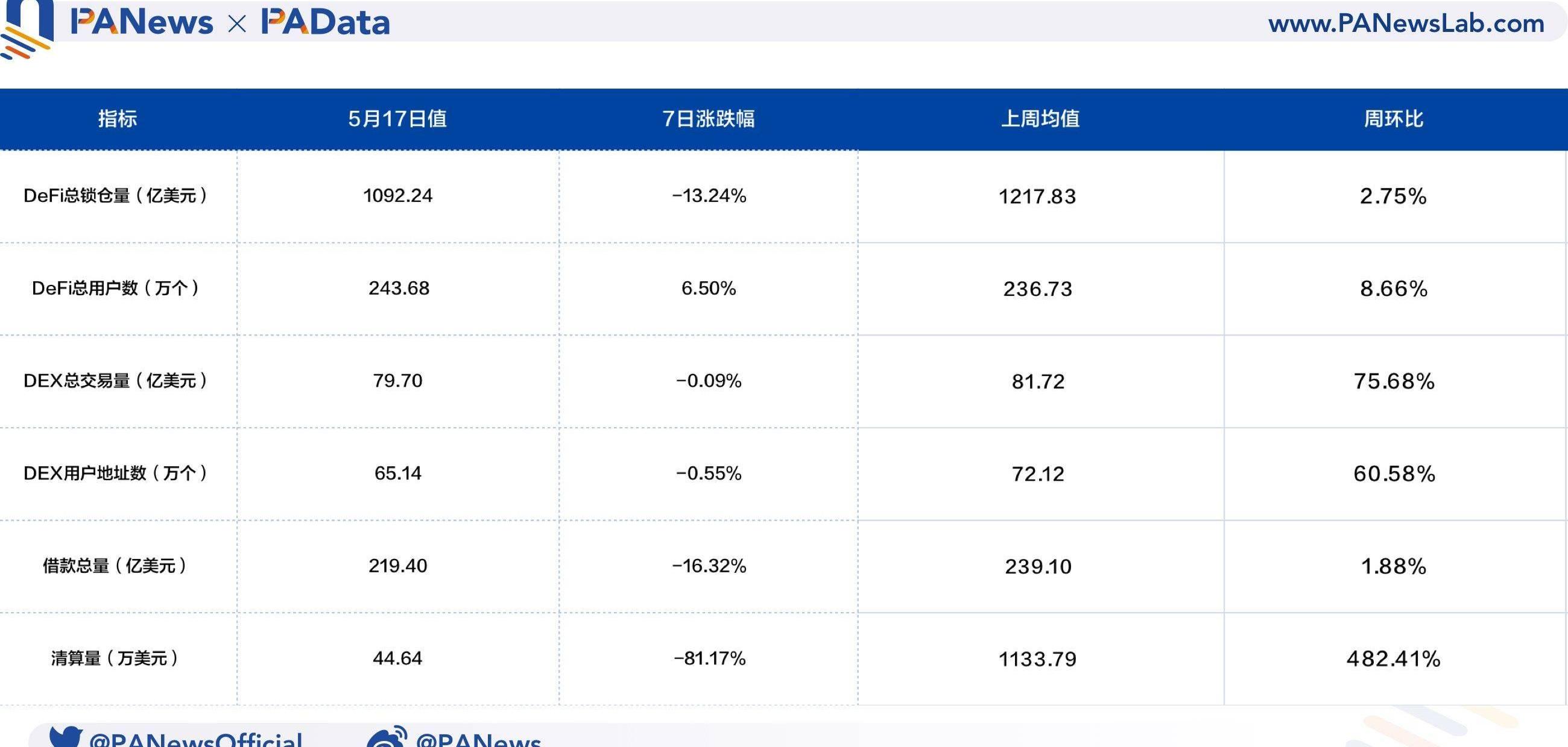 根據DeBank的數據,上周DeFi的總鎖倉量仍保持高位。5月11日達到一周最高值約1315.5億美元,并創下歷史最高值。5月16日總鎖倉量已回落至上周平均水平左右,約為1152.8億美元。雖然上周DeFi總鎖倉量刷新了歷史最高值,但其一周平均值相比前一周只增長了約2.75%。截至今日發稿前,DeFi總鎖倉量為約1092.24億美元,7日跌幅約為13.24%。