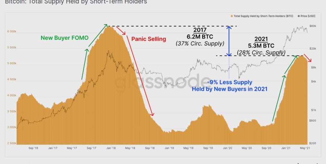 然而,需要注意的是,目前STH擁有的加密貨幣的峰值在加密貨幣數量和流通供應的百分比上都大大低于2017年。新持有人的加密貨幣最近達到了流通供應量的28%,比2017年的頂峰時少了9%。