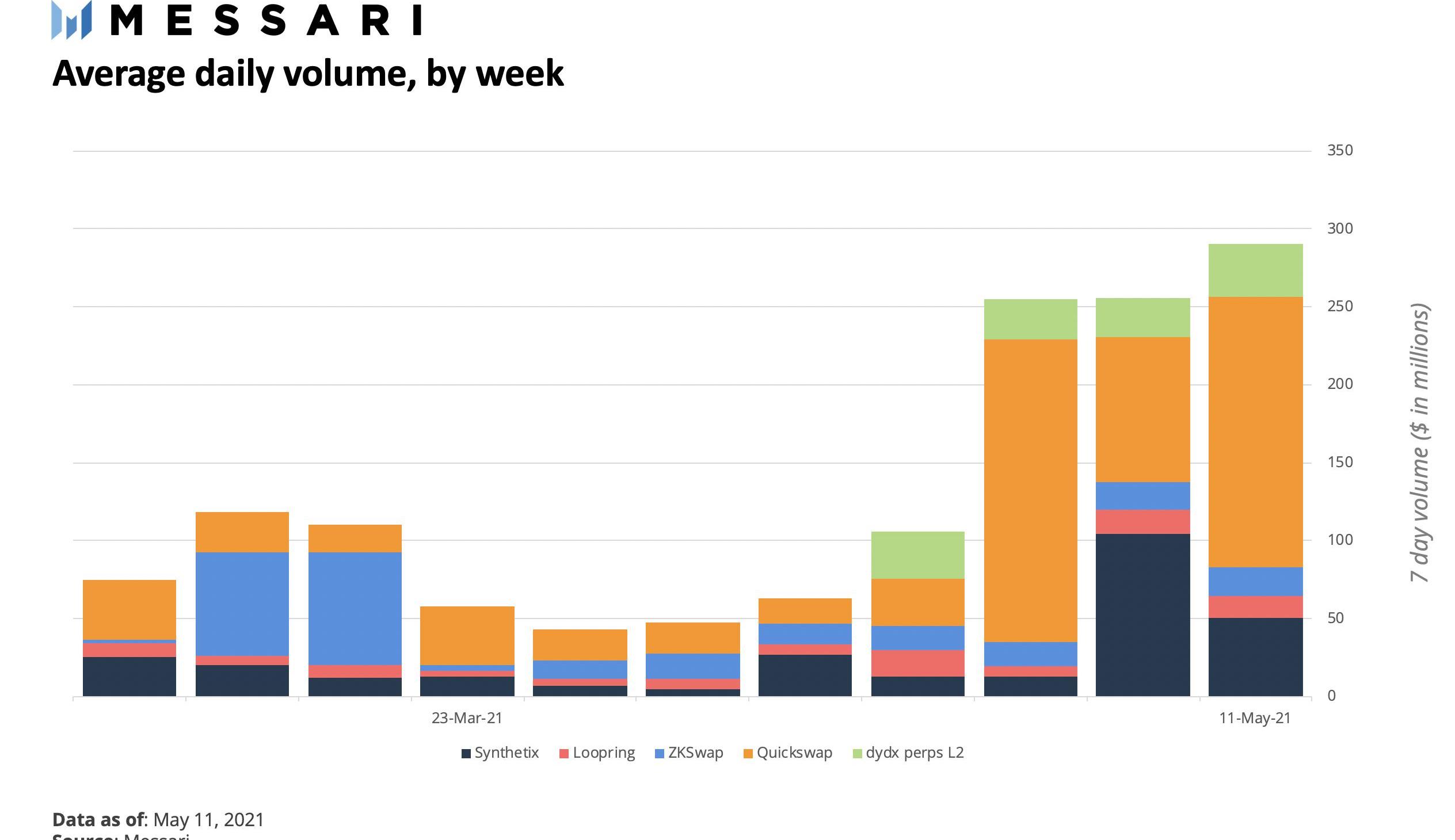 而Polygon也作為一種具有成本效益的DeFi協議選擇突然出現在了這個舞臺上。它最大的兩個金融應用是Uniswap-fork的Quickswap和DeFi寵兒Aave。Polygon上的Aave自4月初推出以來,截至5月11日,已經吸引了超過33億美元的鎖定價值,約為Aavev2鎖定價值的四分之一。Quickswap在4月份促成了7600萬美元的日均交易量,約為Uniswap和SushiSwap同期平均交易量的6%和21%。