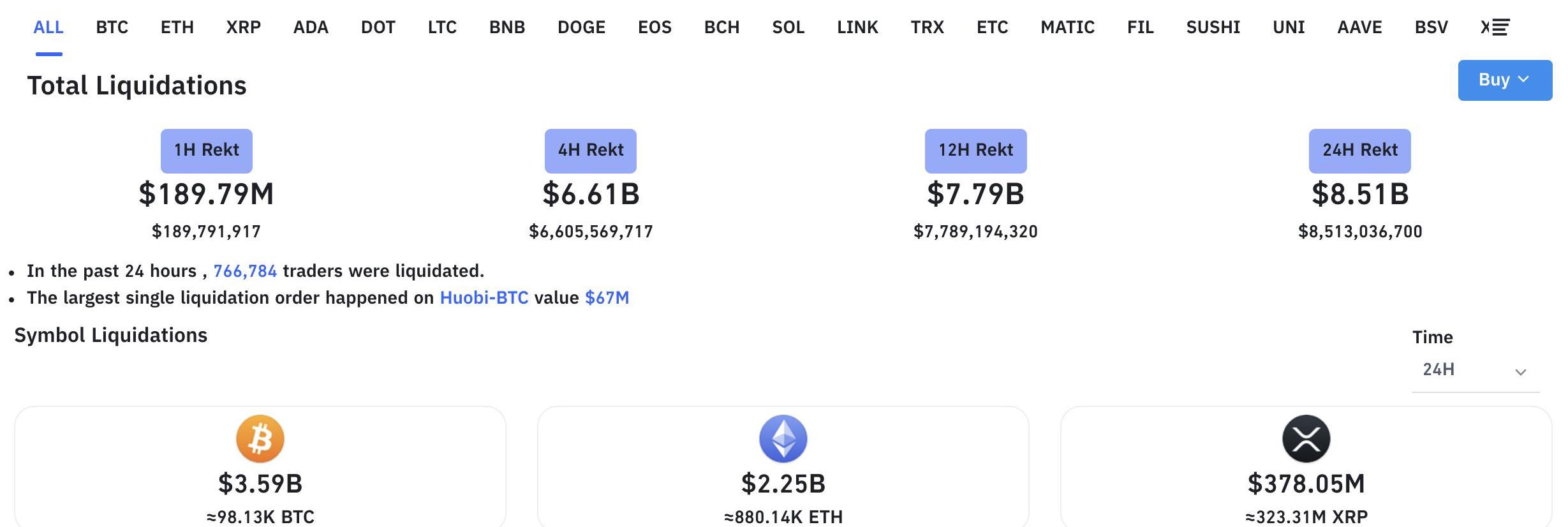 加密市場的清算總額正在迅速增長,Bybt數據顯示,截至發稿時,清算總額已超過80億美元,高于2020年3月12-13日的清算總額,但仍低于今年4月18日的97.95億美元,大約90%的交易來自多頭頭寸。最大的一筆清算訂單發生在火幣平臺,價值6700萬美元。
