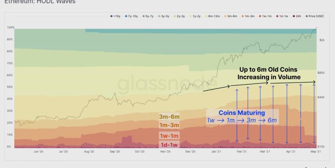 首先,我們回顧以太坊HODL波,以觀察休眠的以太坊行為。我們可以看到與比特幣存在非常相似的趨勢,即自2020年末以來,以太坊似乎已經從1周到6個月以上到期。還可以看出,1個月至6個月大的加密貨幣的厚度在逐漸增加,這表明在早期牛市中積累的HODLing加密貨幣仍然是一種受人歡迎的策略