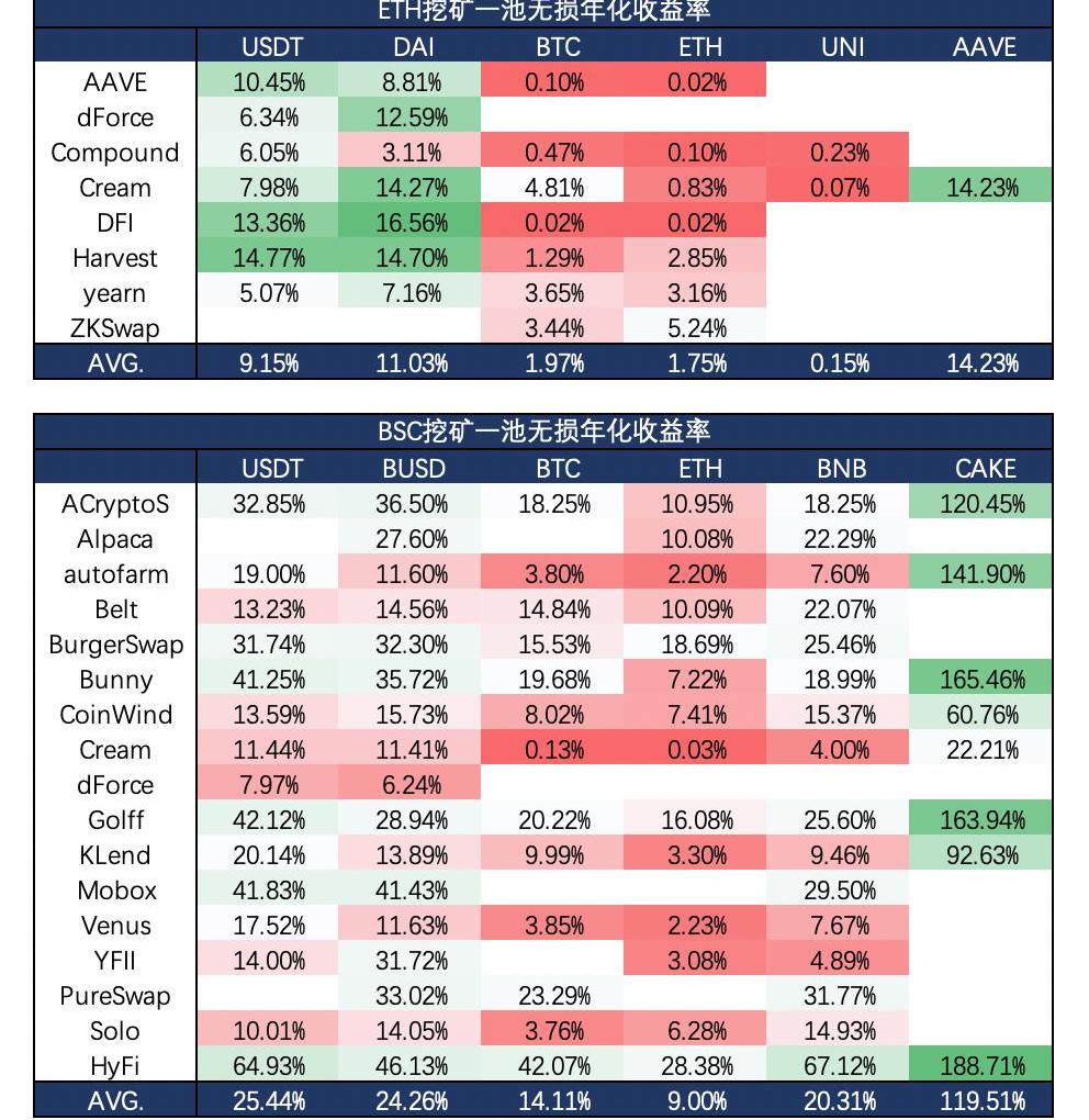 BSC上DeFi生態的快速發展與其超高收益或有一定關系。根據流動性挖礦年收收益監測網站apy999.com的統計,僅從一池單幣挖礦的無損年化收益率來看,以太坊上DeFi挖礦的平均收益約為6.38%,而BSC上DeFi挖礦的平均收益則高達35.44%。