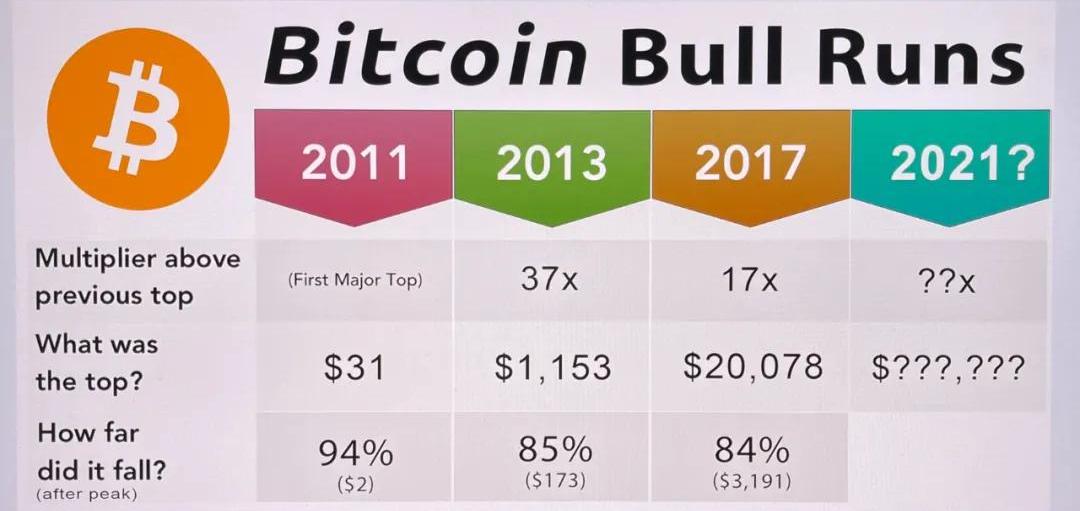 即使我們假設模式繼續發生但乘數減少,也可以較為公平地預期BTC比以前的ATH將增加8倍,也就是20,000美元乘以8,即大概在16萬美元一枚。