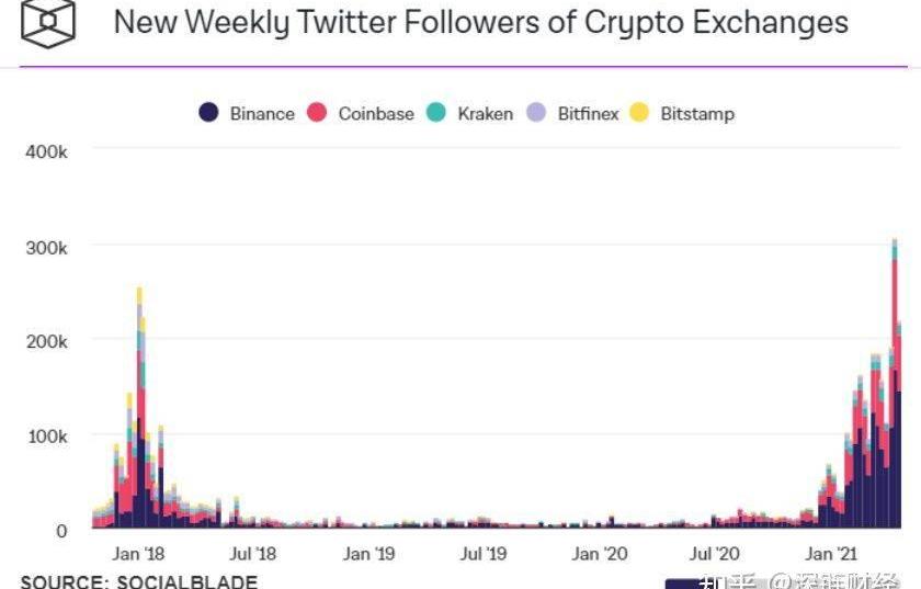 由上圖可知,今年以來幣圈主流交易所以及服務提供商的推特新增粉絲都不斷增長,增長量是去年的數倍,這也是新人入場最擲地有聲的證據。