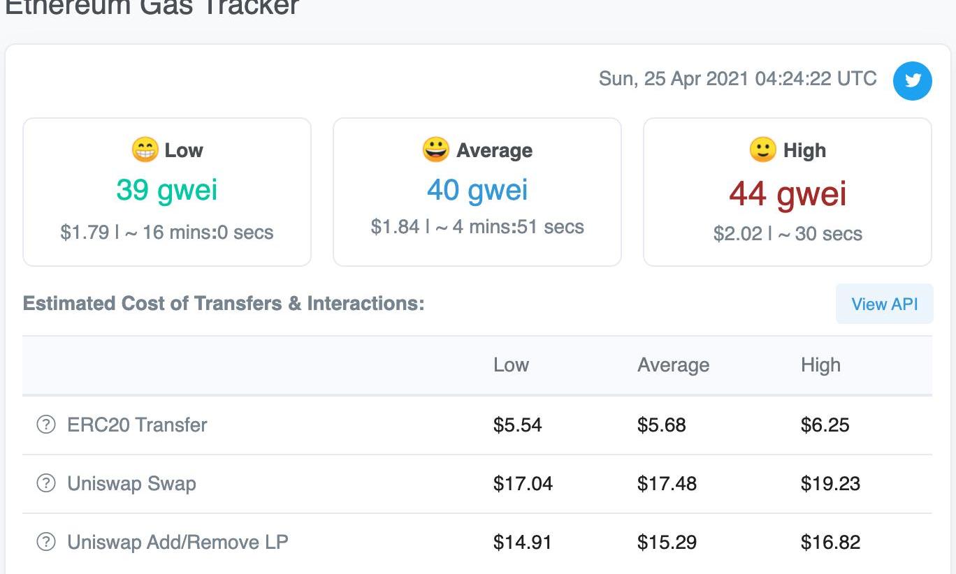XRP/HKD-2.81%PAData?4月25日,根據Etherscan的監測,截至4月25日午時12:30左右,以太坊上的交易以平均速度打包的交易只需要花費40gwei,以最低速度打包的交易只需花費39gwei,即使以最高速度打包的交易也只需花費44gwei。以ERC-20代幣的交易為例,這意味著當前實現最快交易的手續費大約為6.25美元,較此前大幅下降。